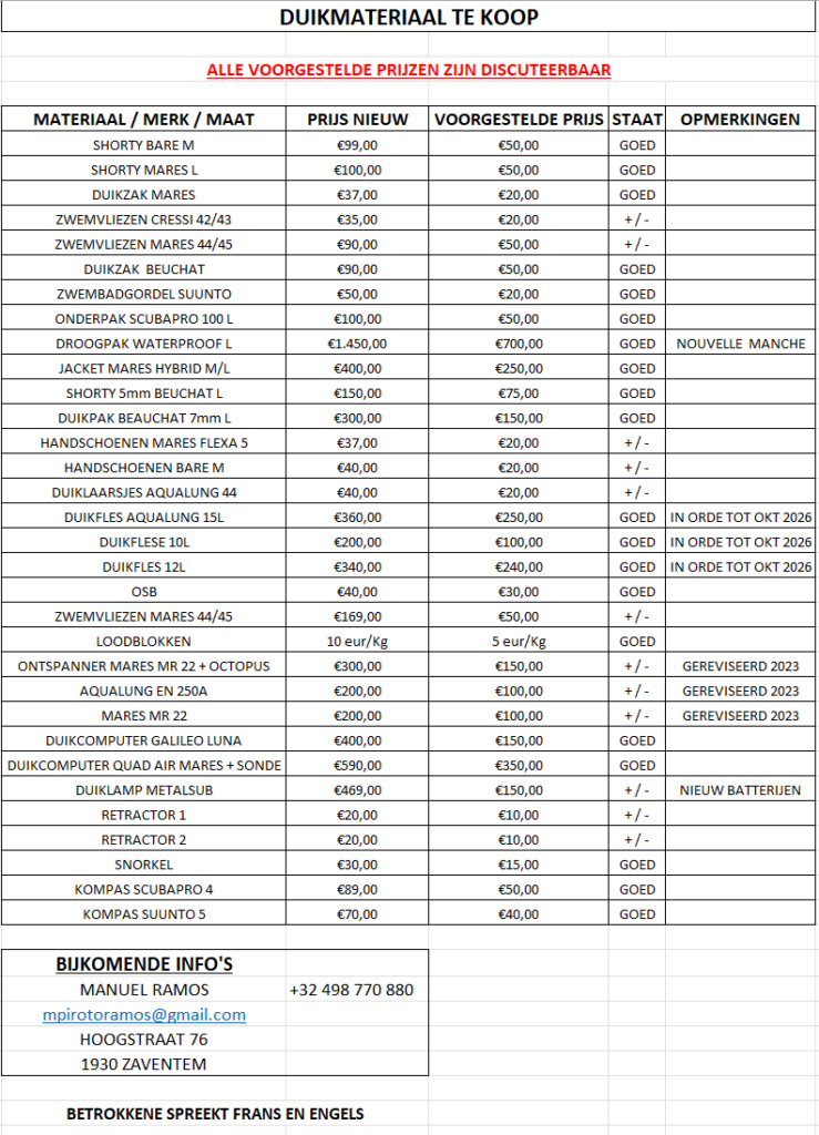 De lijst van het duikmateriaal van Manuel Ramos en zijn zoon Tomas, ze zijn een tijdje geleden gestopt met duiken. Twijfel niet Manu te contacteren.